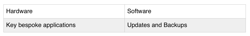 This should details how backups are taken and when, when updates are sent out, what this might affect etc. Building up a picture of how PC’s are updated so if an issues arises due to an update the team are better equipped to diagnose the issue quickly.